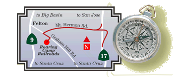 Take Interstate 5 to State Route 152 (near Gilroy). Drive west on SR-152 to SR-1, then north on SR-1 to Santa Cruz. Take SR-17 from Santa Cruz northeast to Scotts Valley. Exit at Mt. Hermon Rd. and drive 3.5 miles northwest to Felton. Mt. Hermon Road ends at Graham Hill Road. Turn left on Graham Hill Road and drive 1/2 mile to Roaring Camp (on right). |